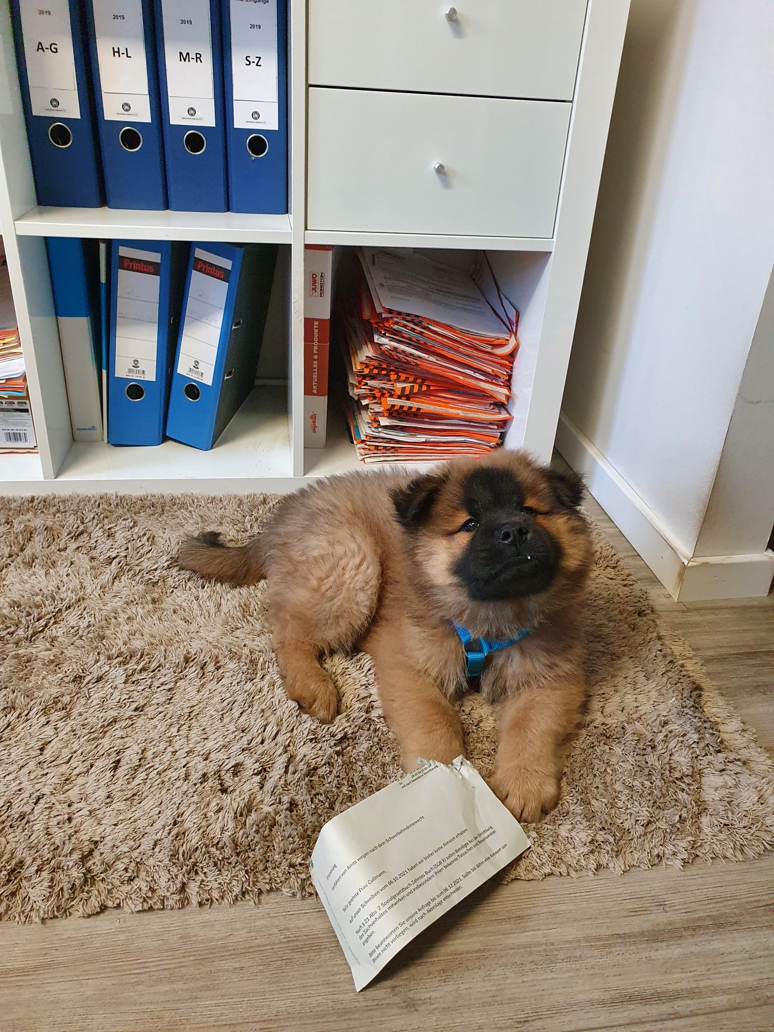 Womit ich nicht so klar komme sind Gewitter und laute Knallgeräusche – weil neben mir mal ein Böller hochgegangen ist. Auch bin ich nicht gerne lange alleine – muß ich zum Glück auch nicht, denn ich darf jeden Tag mit ins Büro. Selbst wenn meine Herrchen mal abends Essen gehen, so komme ich mit, merkt eh keiner, dass ich dabei bin.